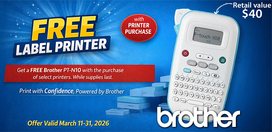 When you purchase a qualifying Brother printer, you’ll receive a FREE Brother Label Printer - a practical tool for labeling files, organizing supplies, and keeping your workspace efficient.